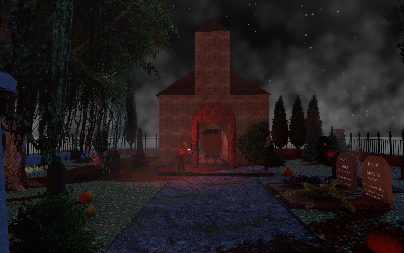 Gotische Kapelle im nebligen Friedhof: lavarote Wände, Fackelschein, Spinnweben – und eine riesige Grabstein-Bar (RIP Nüchternheit). Langer Backstein-Saal mit Pole-Spot, sargartigen Bänken und kerzenbeleuchteten Stehtischen. Beim Eintreten glimmen Kürbisse im Garten, drinnen wabert roter Dunst über dem Boden und der Bass schlägt wie ein Herz unter dem Gewölbe.