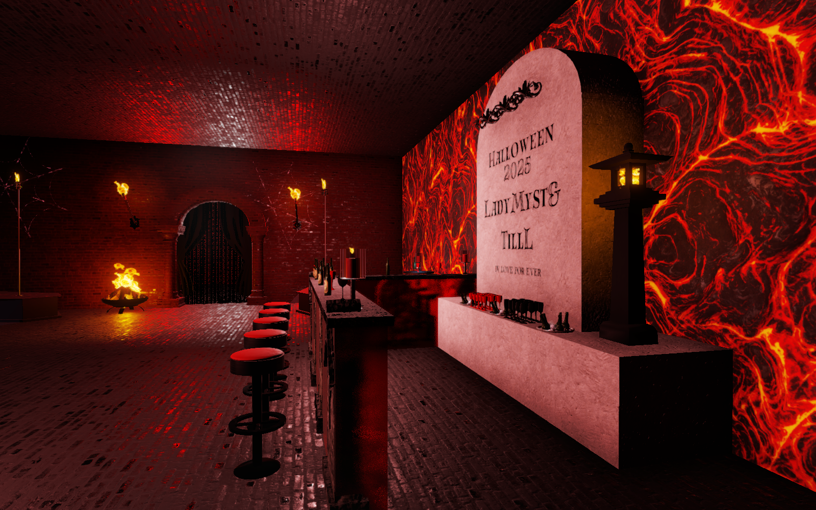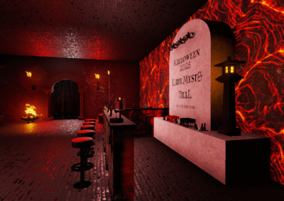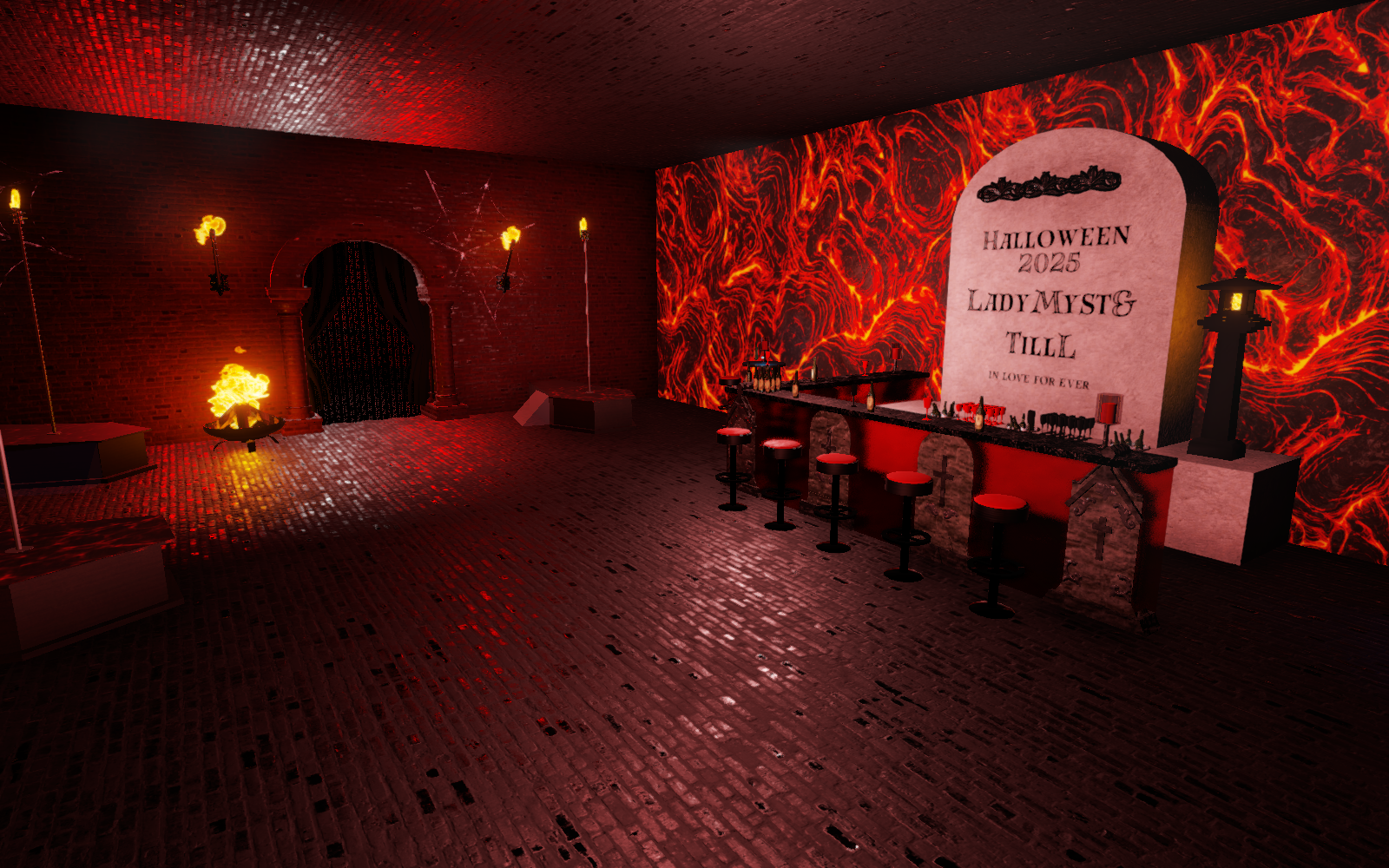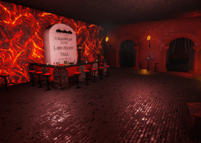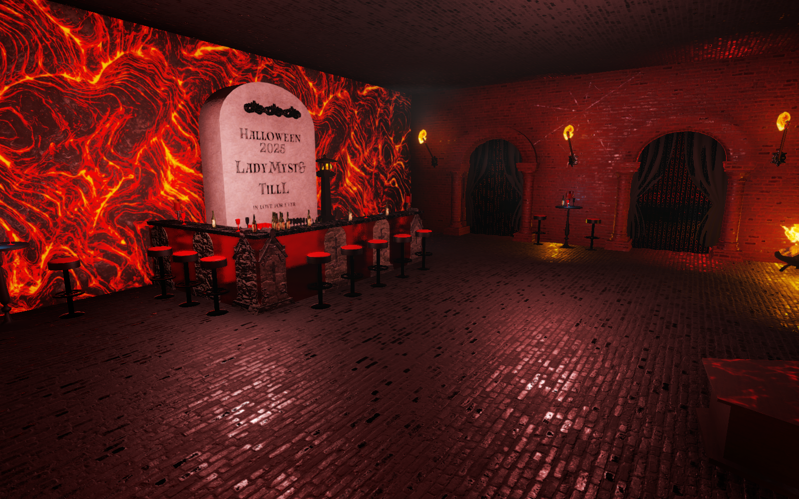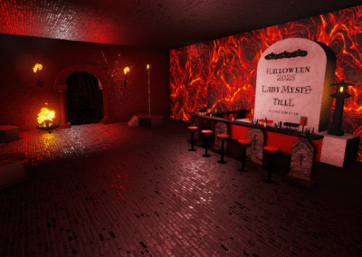 Gotische Kapelle im nebligen Friedhof: lavarote Wände, Fackelschein, Spinnweben – und eine riesige Grabstein-Bar (RIP Nüchternheit). Langer Backstein-Saal mit Pole-Spot, sargartigen Bänken und kerzenbeleuchteten Stehtischen. Beim Eintreten glimmen Kürbisse im Garten, drinnen wabert roter Dunst über dem Boden und der Bass schlägt wie ein Herz unter dem Gewölbe.