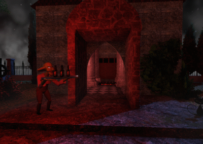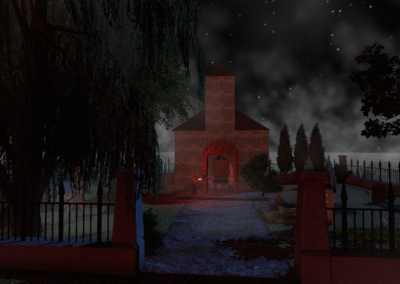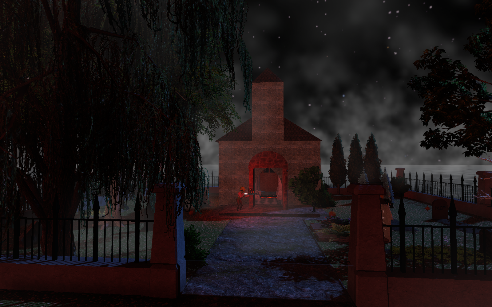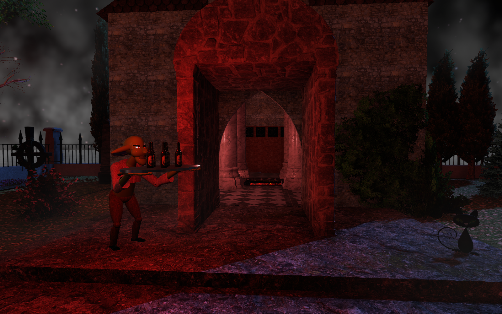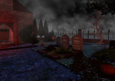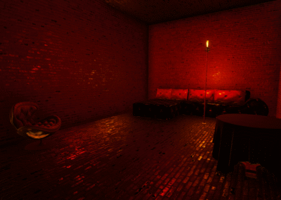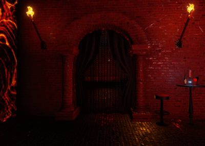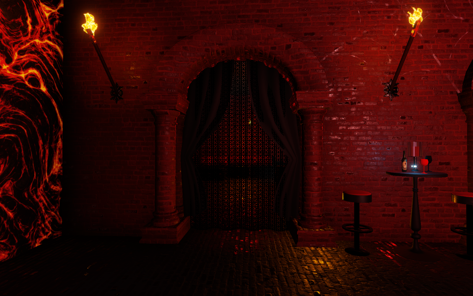 Gotische Kapelle im nebligen Friedhof: lavarote Wände, Fackelschein, Spinnweben – und eine riesige Grabstein-Bar (RIP Nüchternheit). Langer Backstein-Saal mit Pole-Spot, sargartigen Bänken und kerzenbeleuchteten Stehtischen. Beim Eintreten glimmen Kürbisse im Garten, drinnen wabert roter Dunst über dem Boden und der Bass schlägt wie ein Herz unter dem Gewölbe.