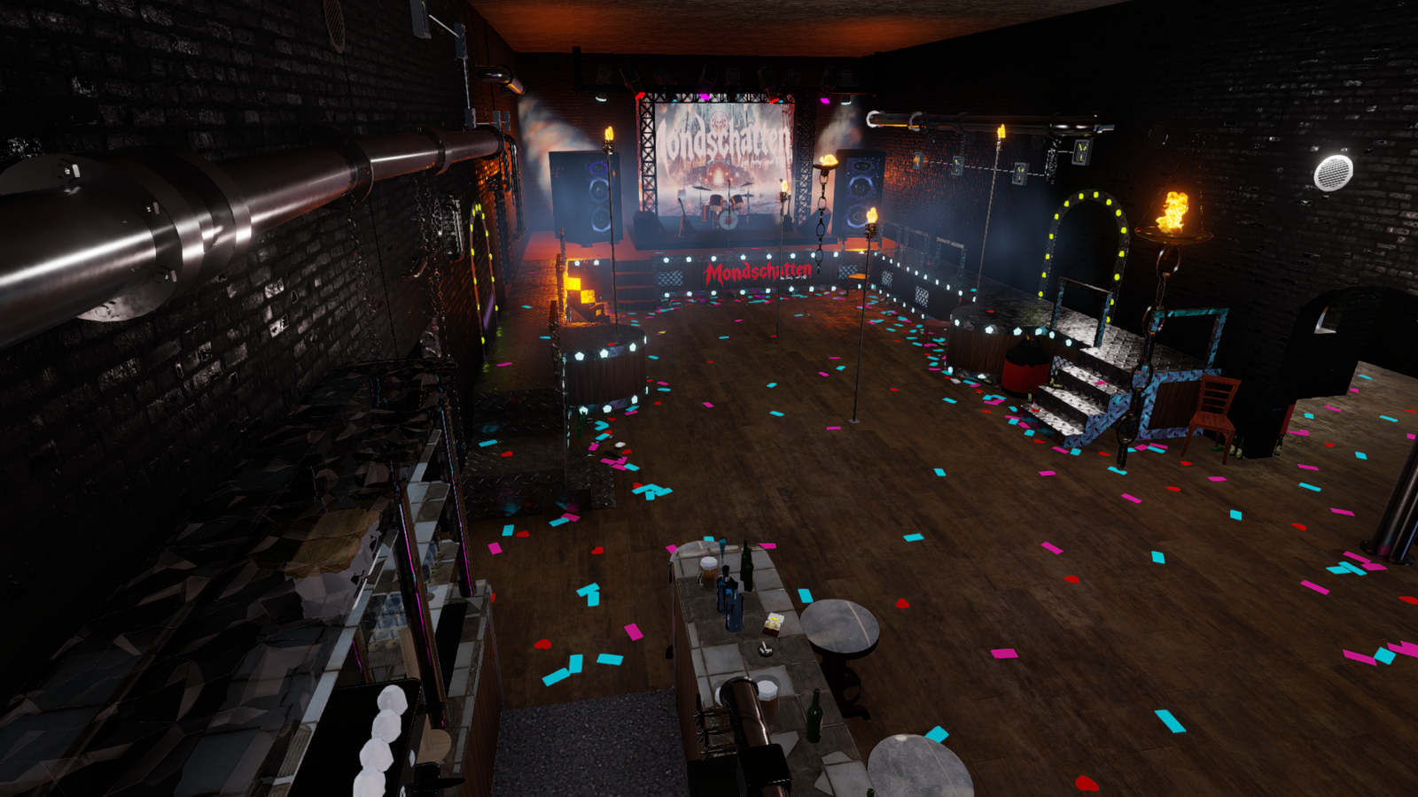 Dunkler Industrial-Club mit Backstein, Stahl und Ketten – roh, sexy, fotogen. In der Mitte der Hauptfloor: leuchtende Pole(s), niedrige Bühne in Riffelblech-Optik, Flammenfackeln und fette PA. Hinten thront die Liveshow-Bühne mit „Mondschatten“-Backdrop, Drumkit & Mics – bereit für Gigs, Karaoke oder Ansprachen.