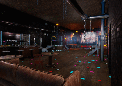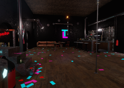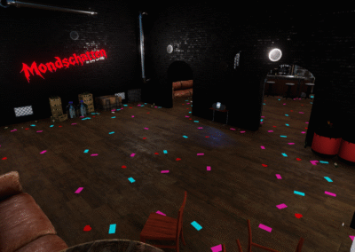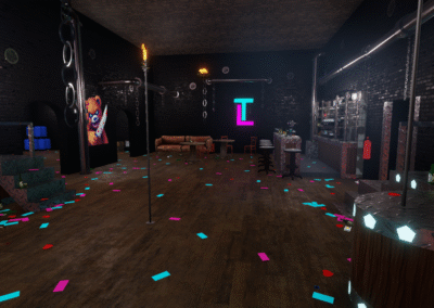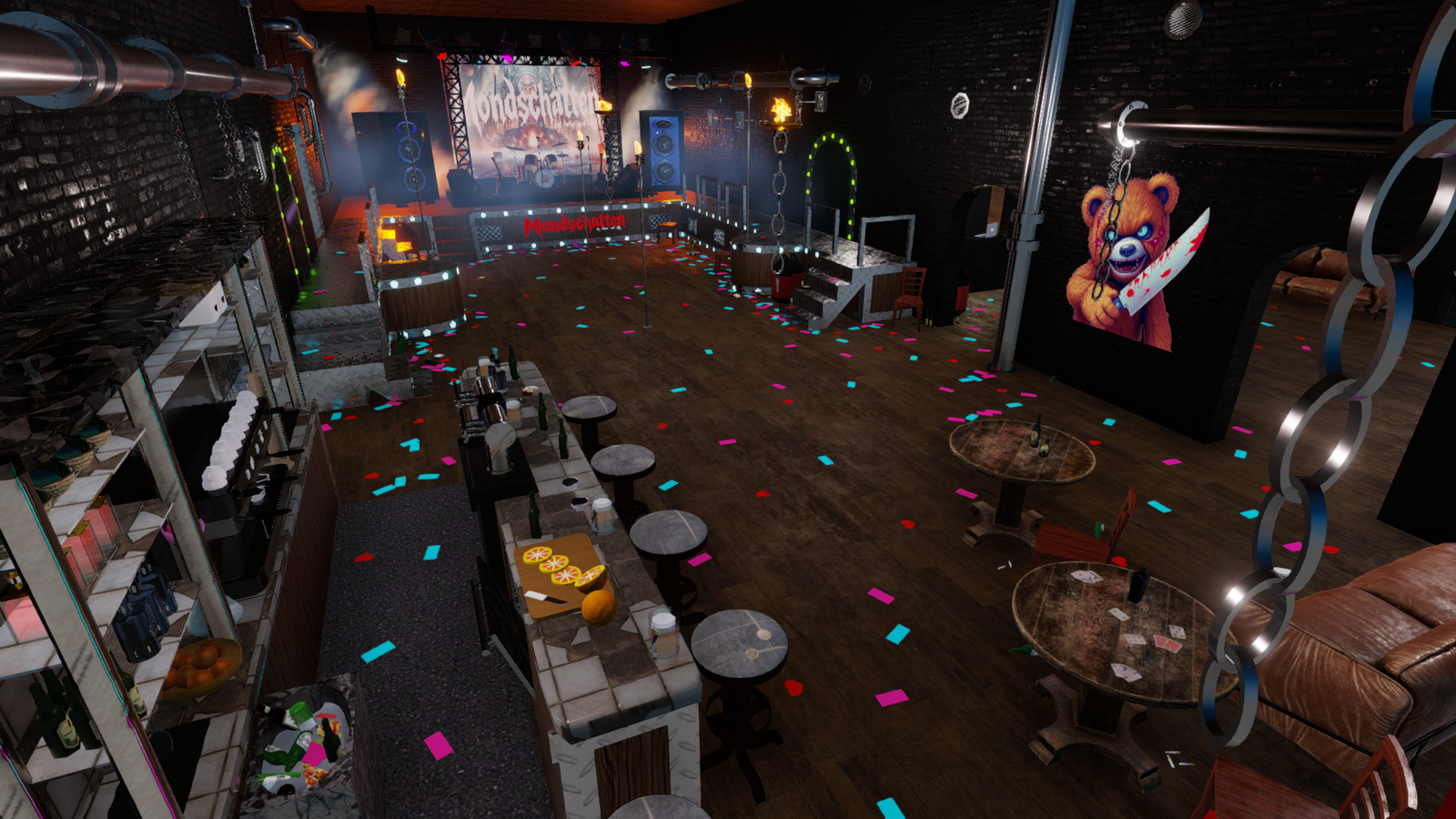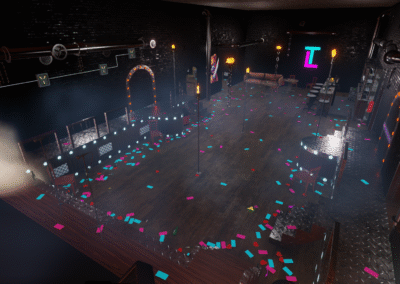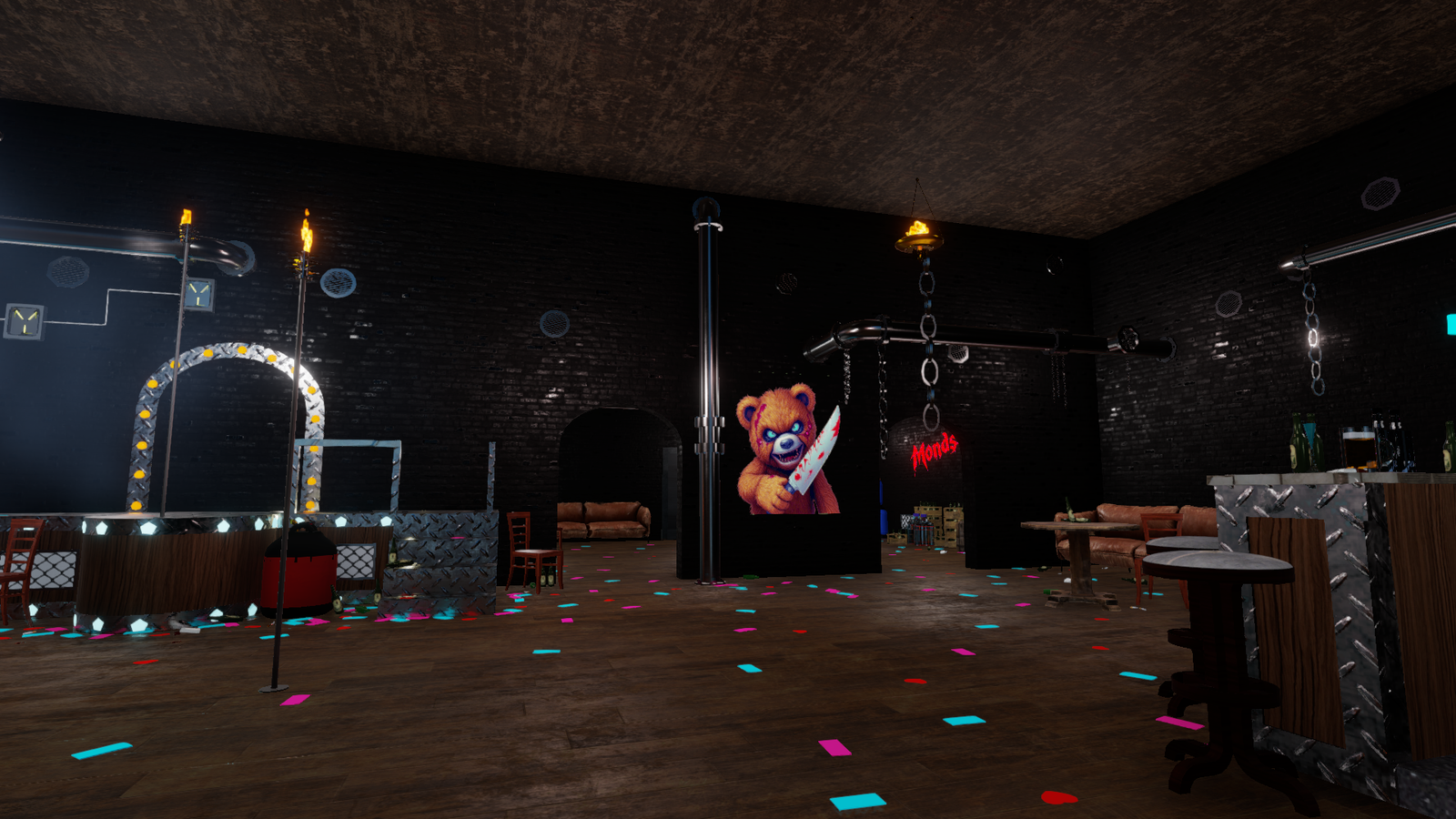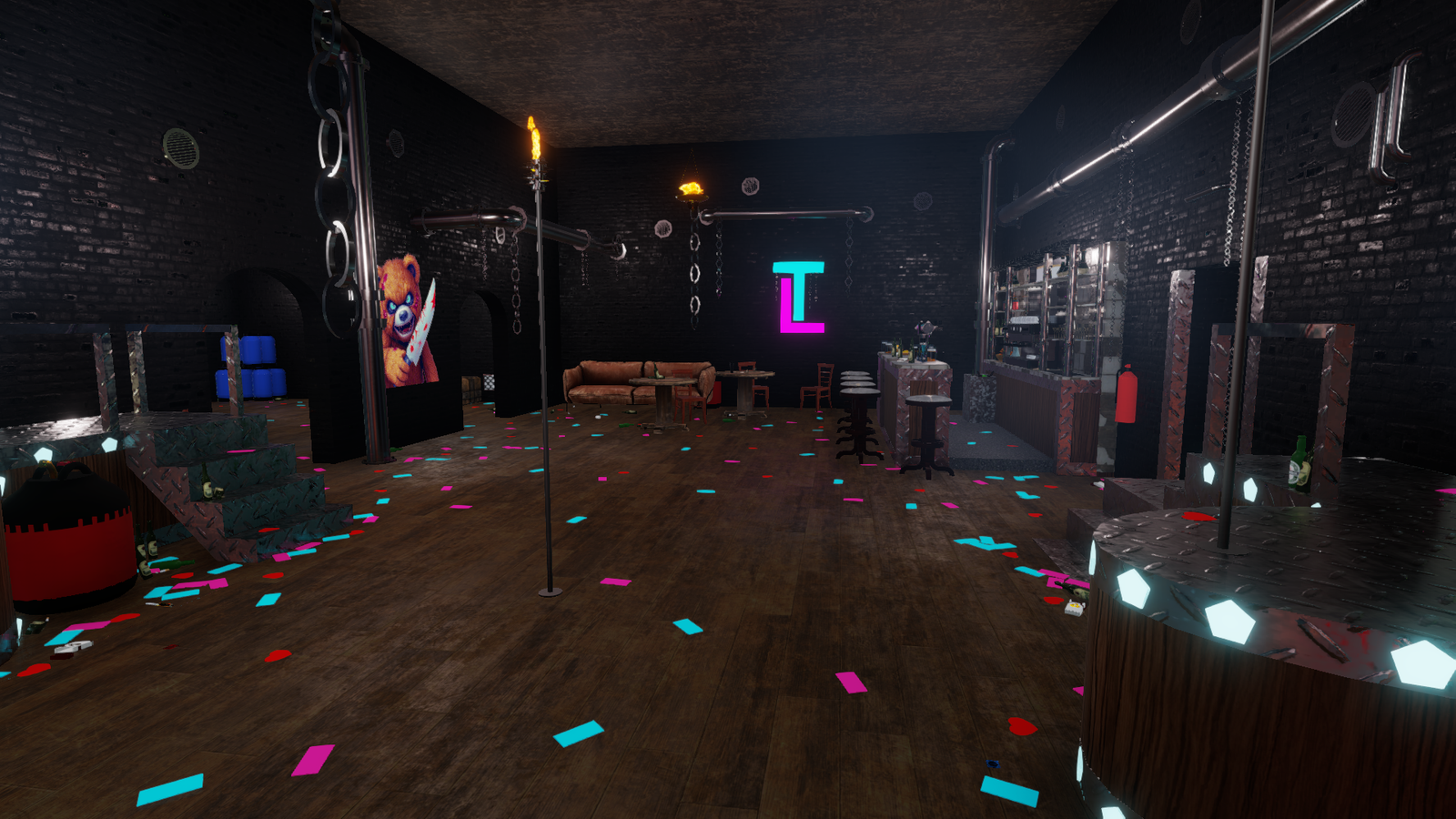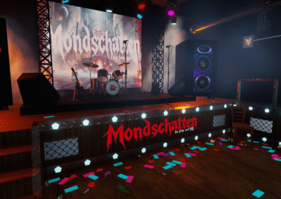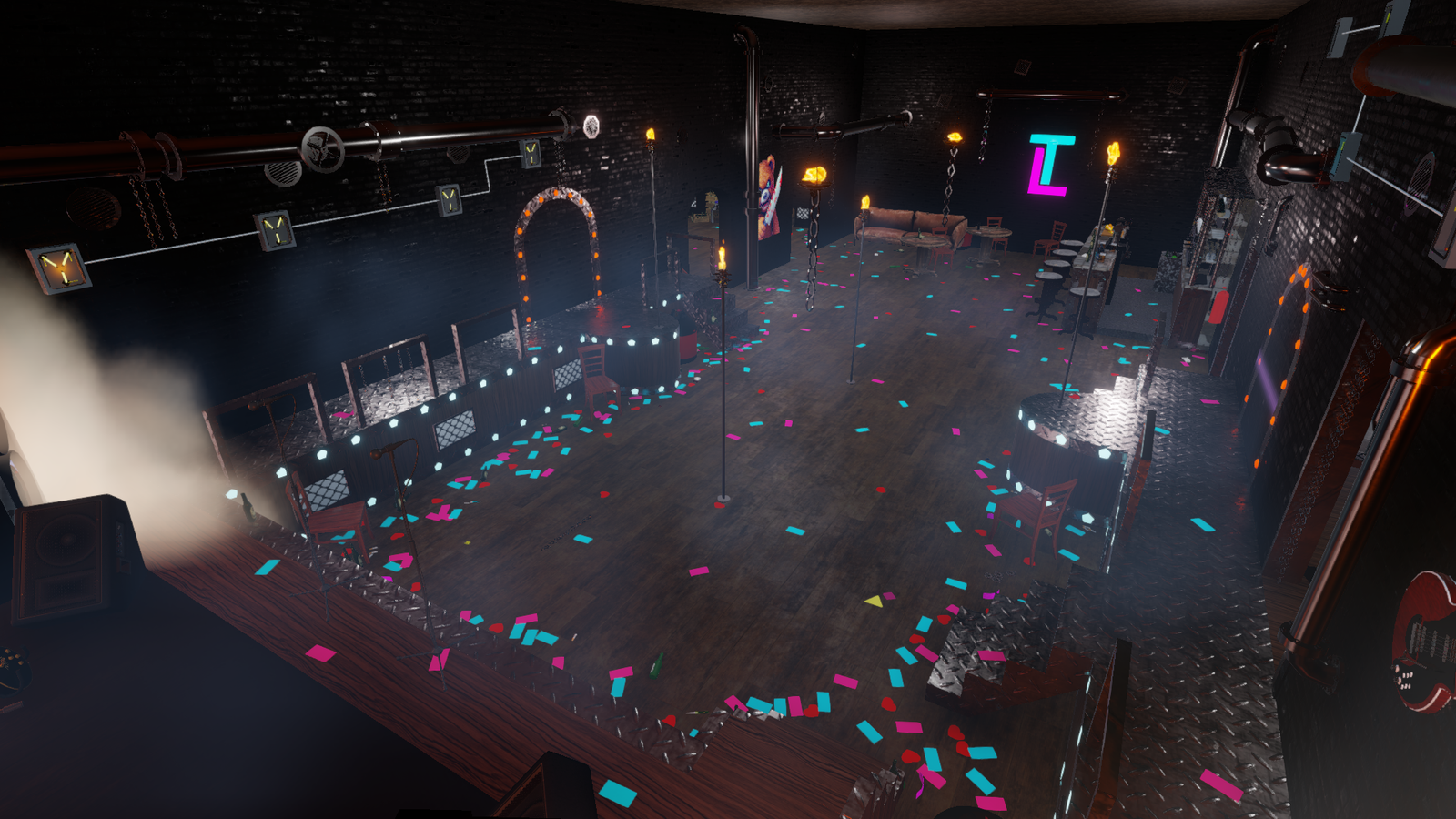 Dunkler Industrial-Club mit Backstein, Stahl und Ketten – roh, sexy, fotogen. In der Mitte der Hauptfloor: leuchtende Pole(s), niedrige Bühne in Riffelblech-Optik, Flammenfackeln und fette PA. Hinten thront die Liveshow-Bühne mit „Mondschatten“-Backdrop, Drumkit & Mics – bereit für Gigs, Karaoke oder Ansprachen.