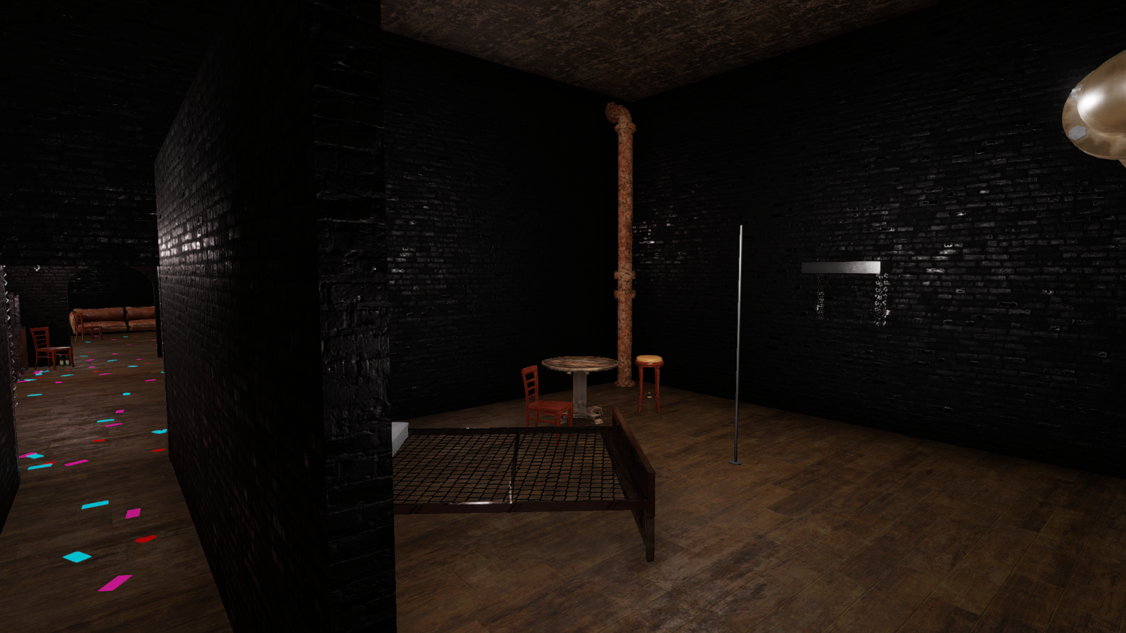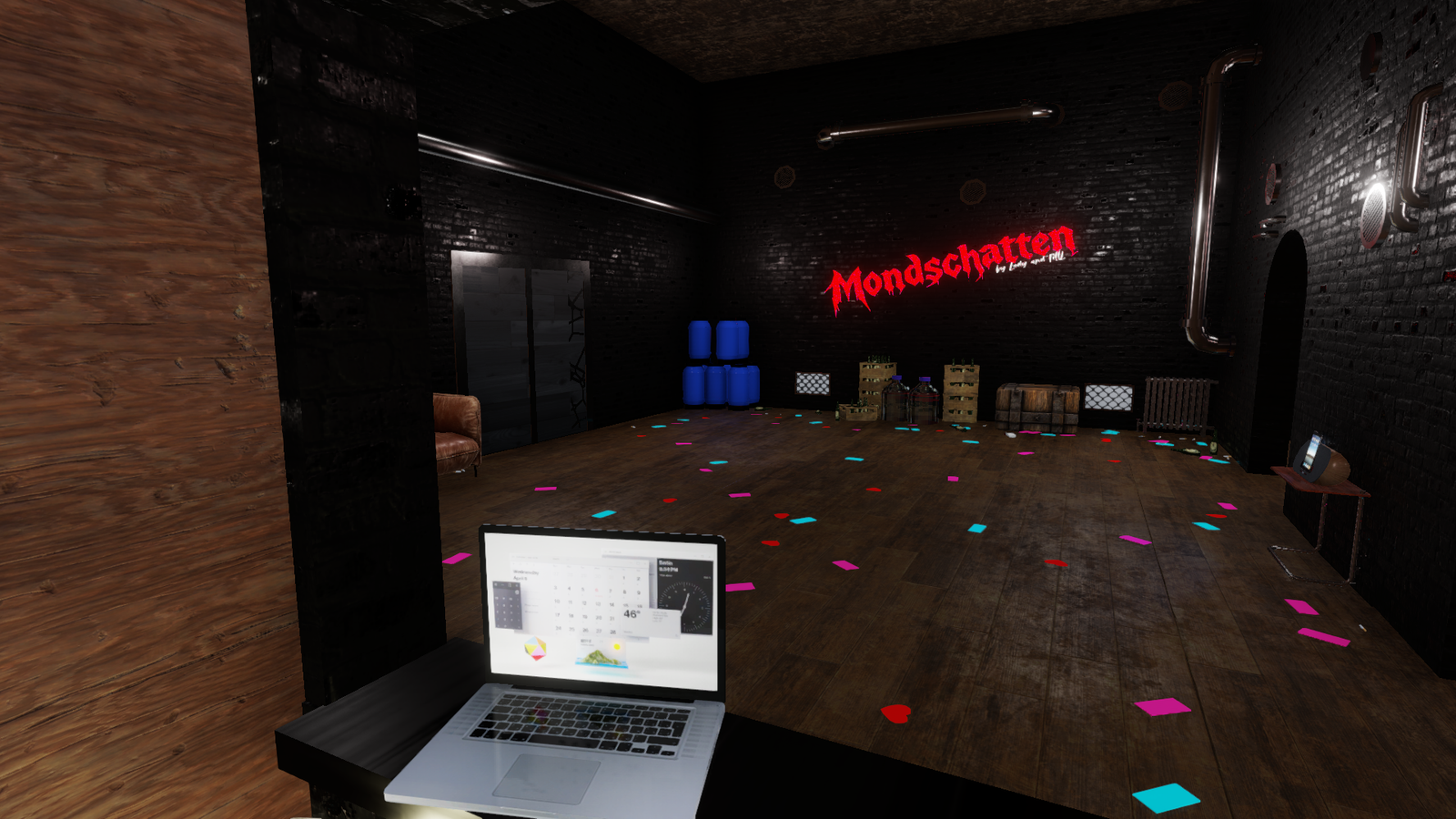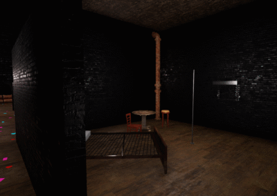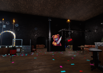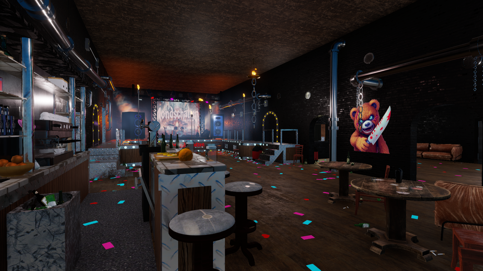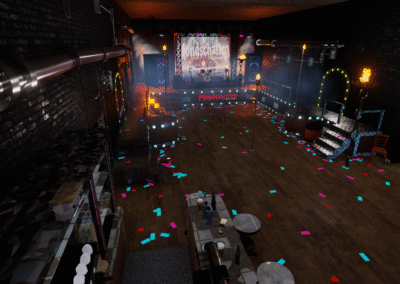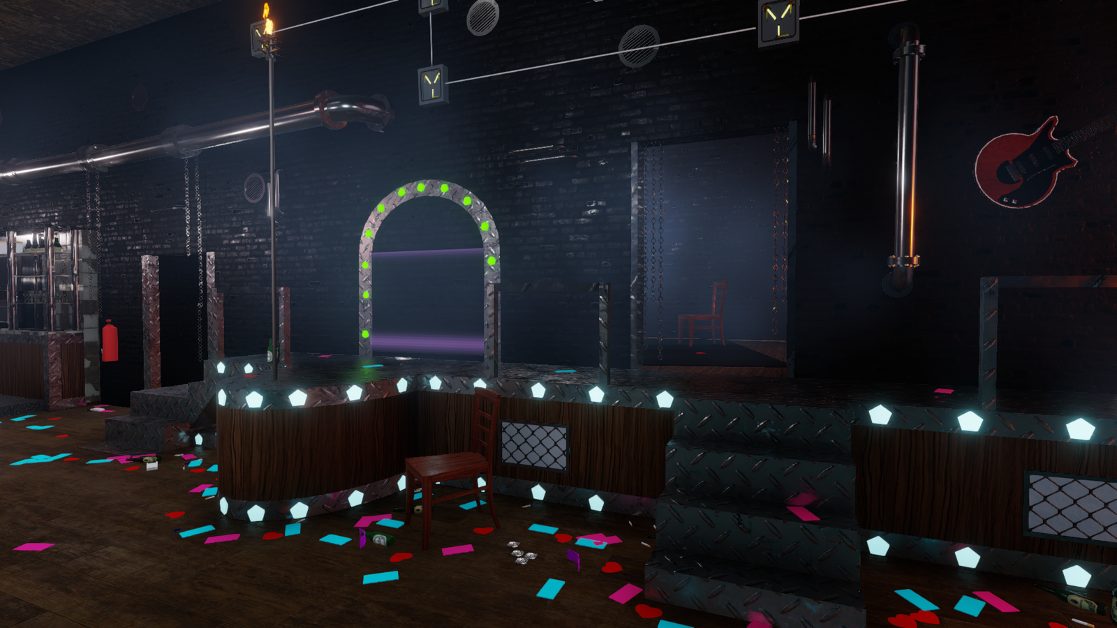 Dunkler Industrial-Club mit Backstein, Stahl und Ketten – roh, sexy, fotogen. In der Mitte der Hauptfloor: leuchtende Pole(s), niedrige Bühne in Riffelblech-Optik, Flammenfackeln und fette PA. Hinten thront die Liveshow-Bühne mit „Mondschatten“-Backdrop, Drumkit & Mics – bereit für Gigs, Karaoke oder Ansprachen.