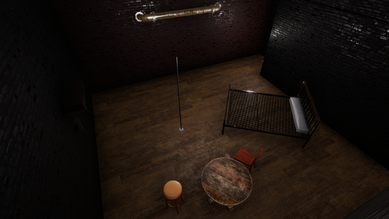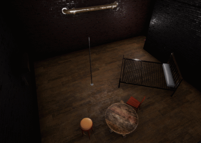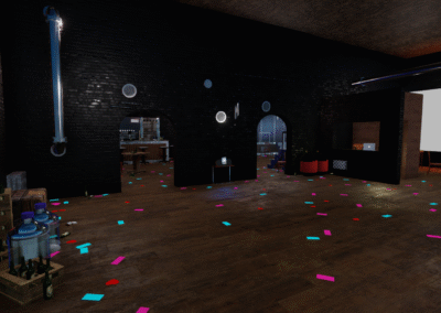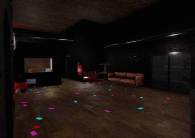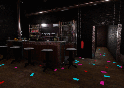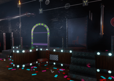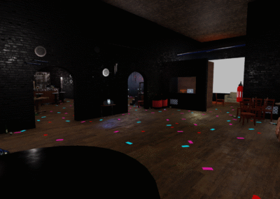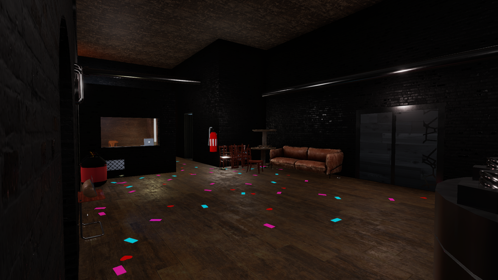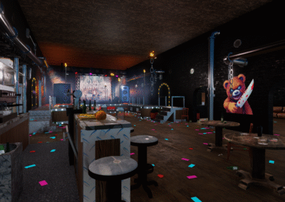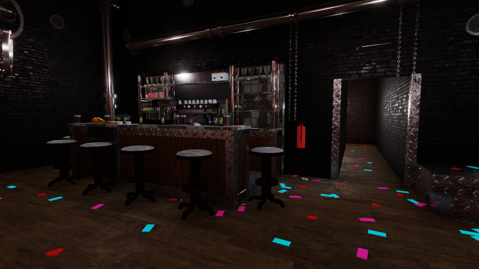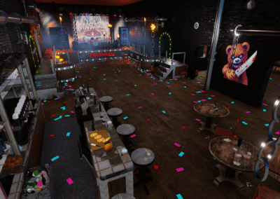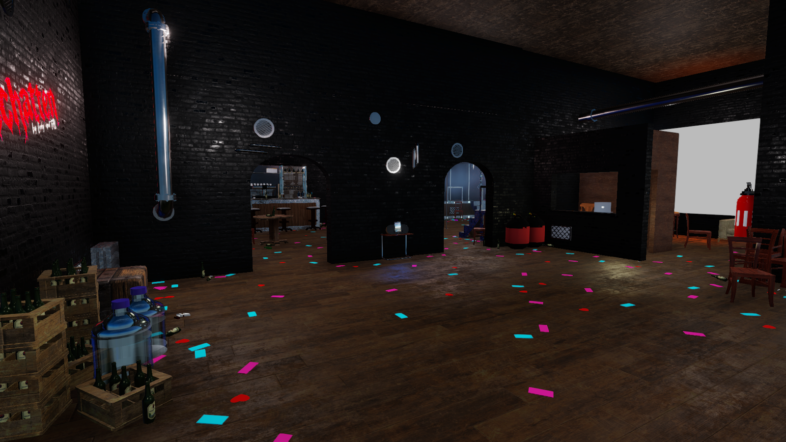 Dunkler Industrial-Club mit Backstein, Stahl und Ketten – roh, sexy, fotogen. In der Mitte der Hauptfloor: leuchtende Pole(s), niedrige Bühne in Riffelblech-Optik, Flammenfackeln und fette PA. Hinten thront die Liveshow-Bühne mit „Mondschatten“-Backdrop, Drumkit & Mics – bereit für Gigs, Karaoke oder Ansprachen.