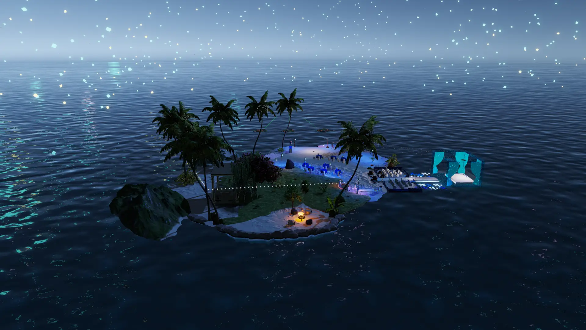 Intime Mikro-Insel im offenen Meer: Palmenkranz, Sternen-Particles überm Wasser und ein warmes Feuer für die Ankunft.