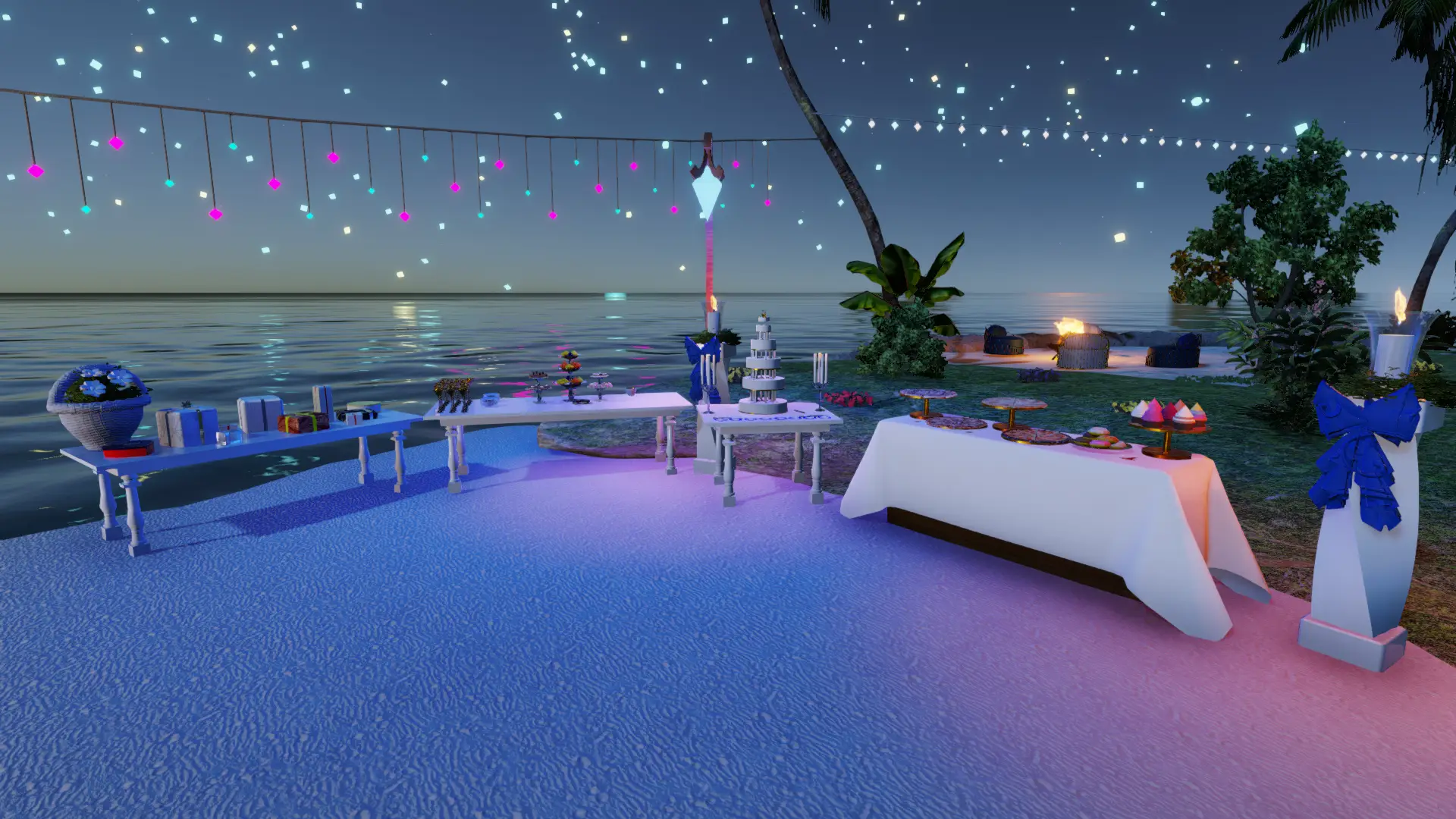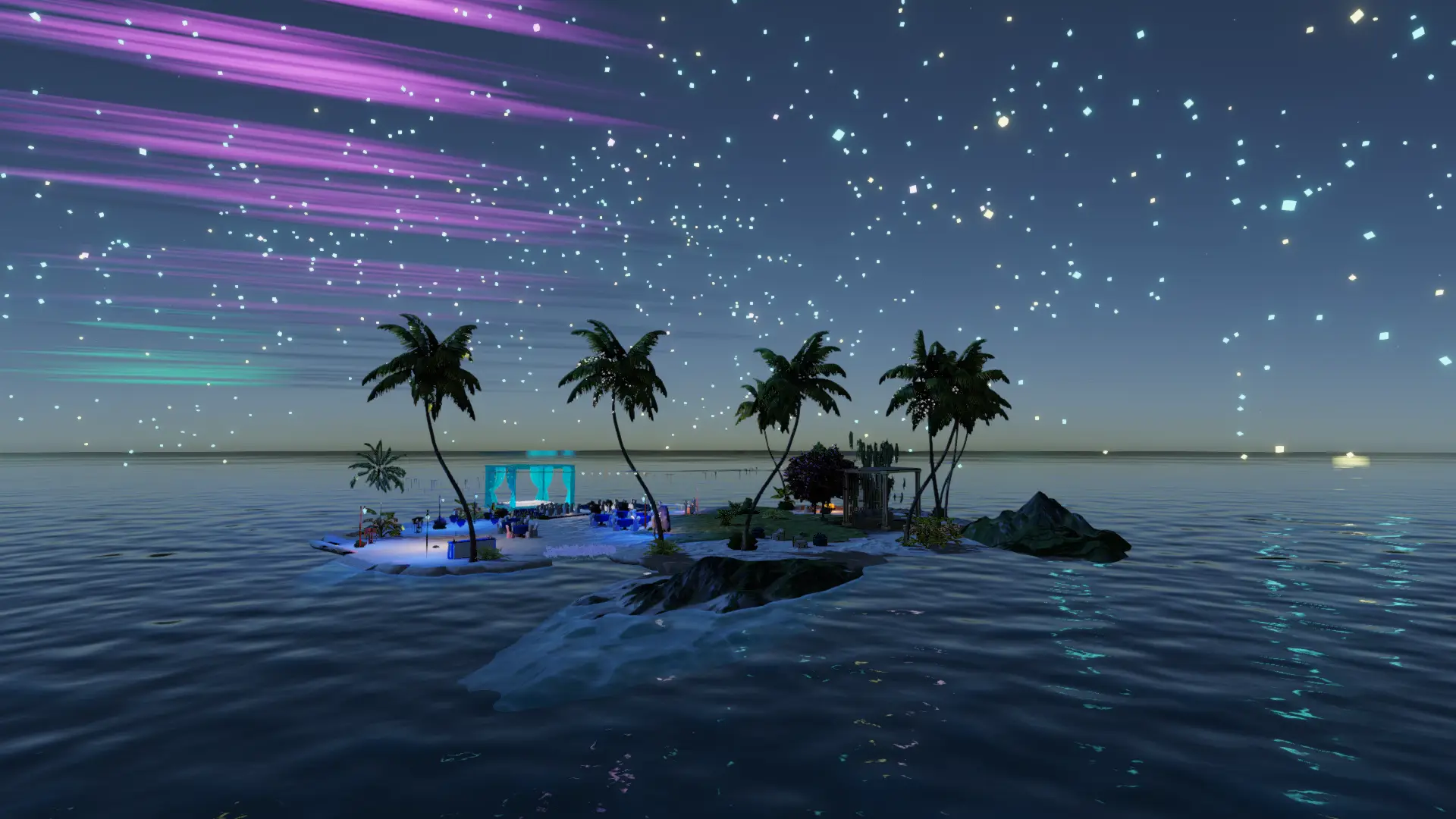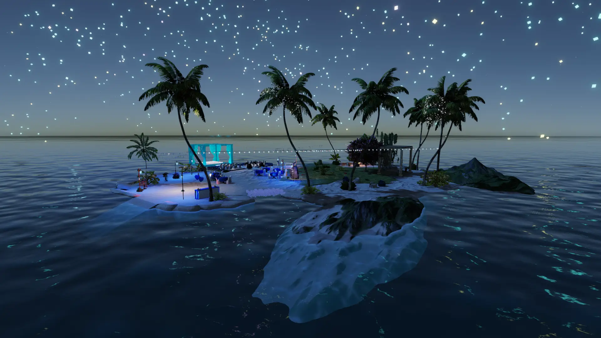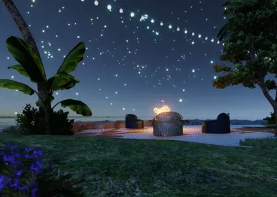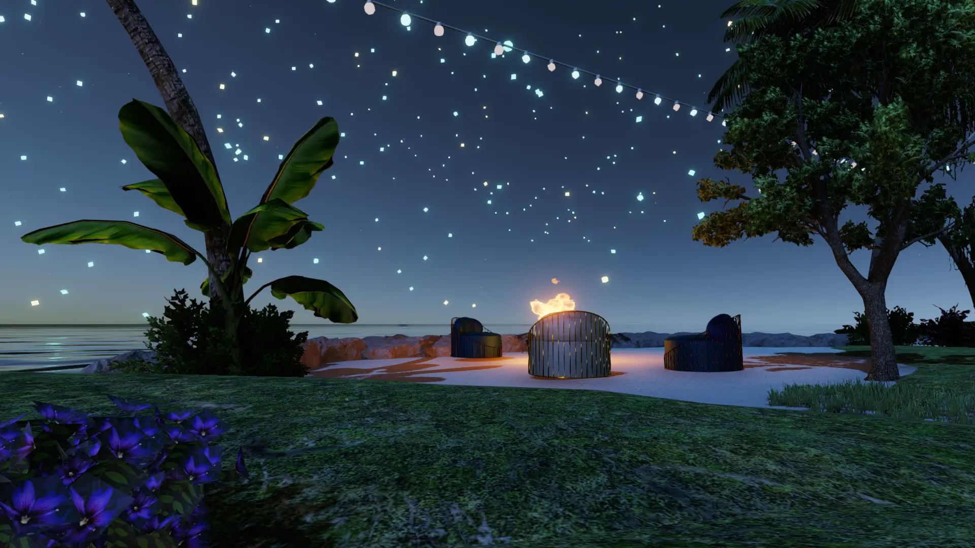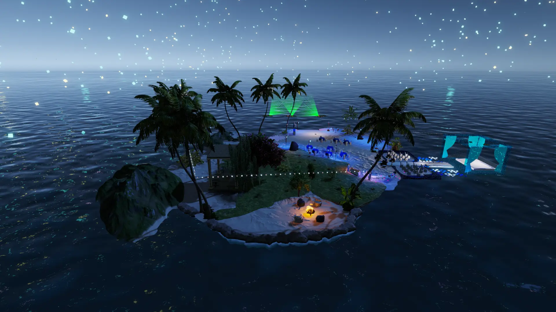 Intime Mikro-Insel im offenen Meer: Palmenkranz, Sternen-Particles überm Wasser und ein warmes Feuer für die Ankunft.