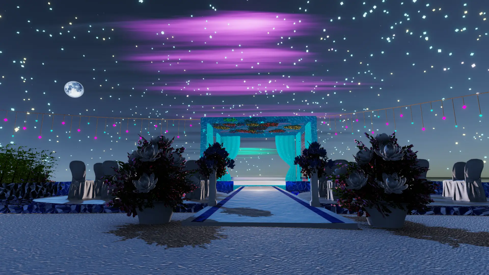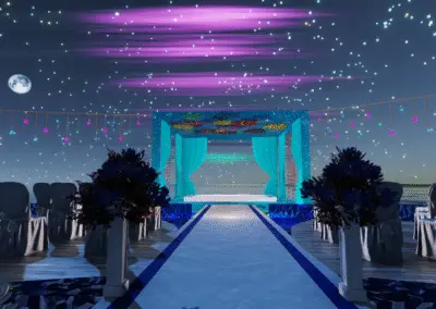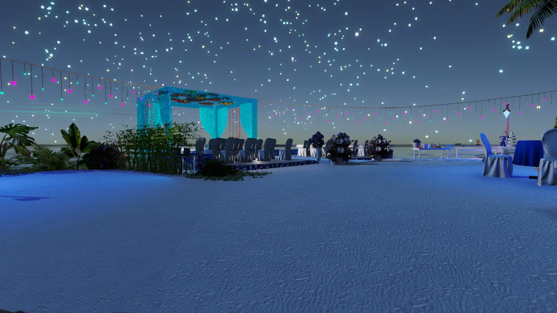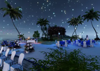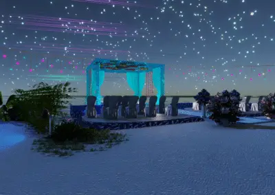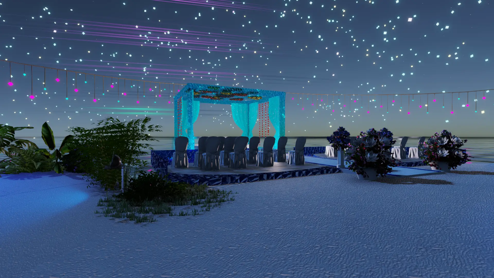 • Zeremonie: Heller Sand-Spot mit blau illuminiertem Trauplatz, zwei Reihen eleganter Stühle, natürlicher Altar-Blick aufs Meer.