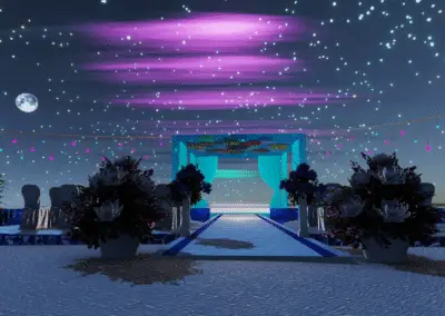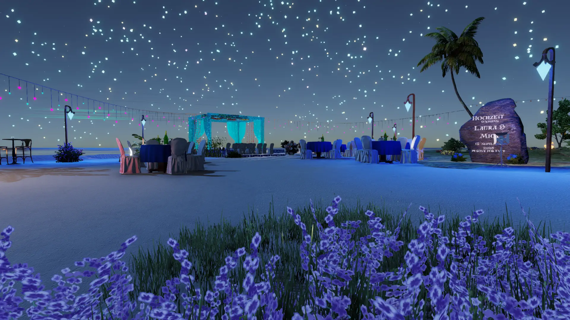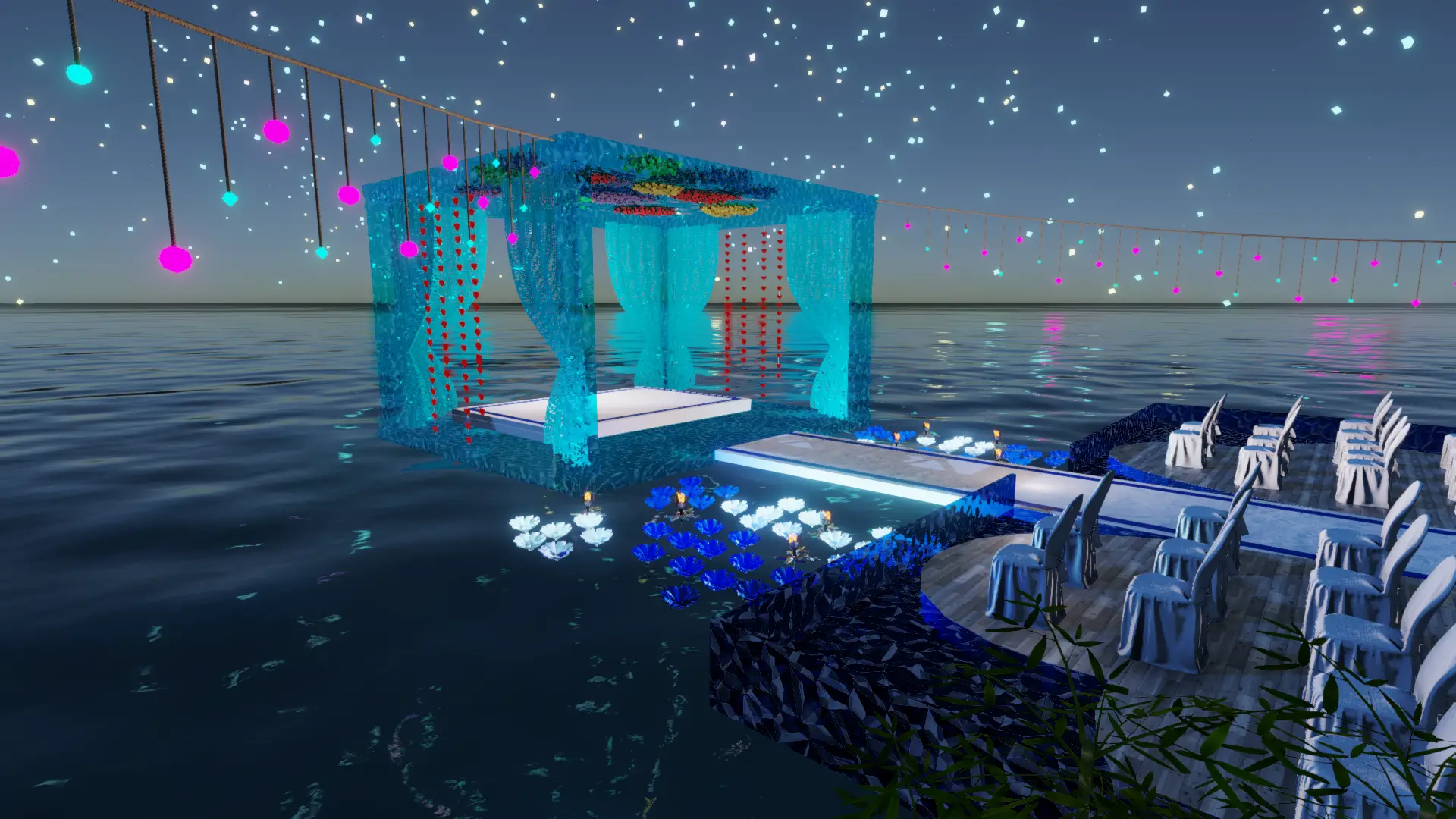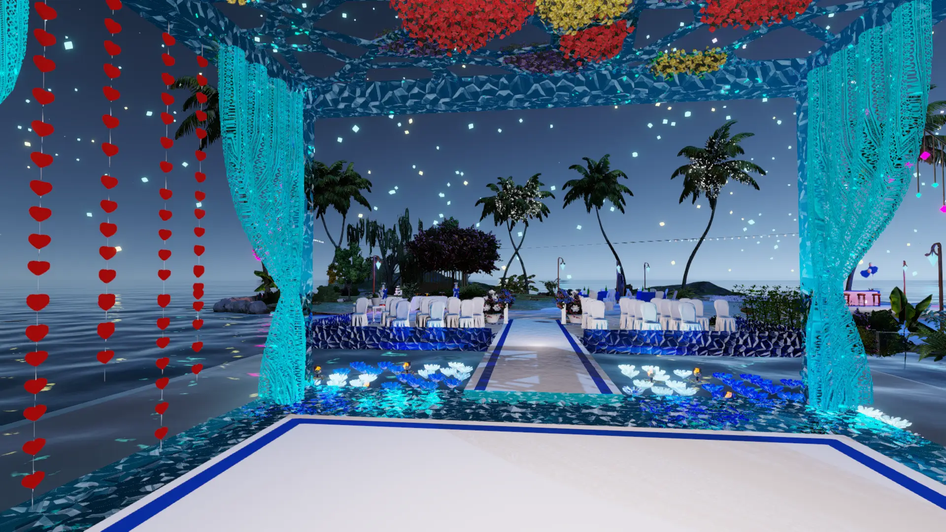 • Zeremonie: Heller Sand-Spot mit blau illuminiertem Trauplatz, zwei Reihen eleganter Stühle, natürlicher Altar-Blick aufs Meer.