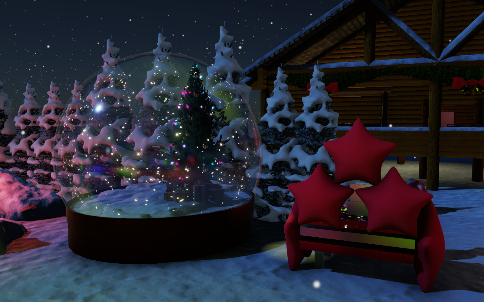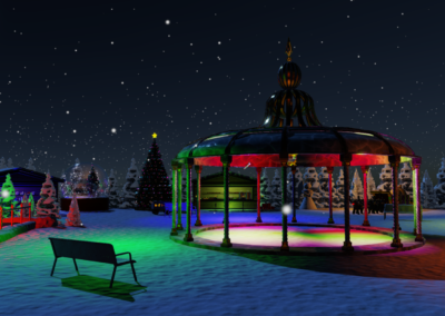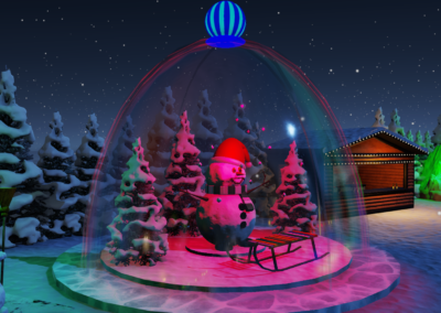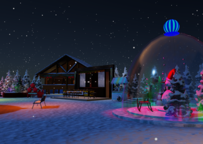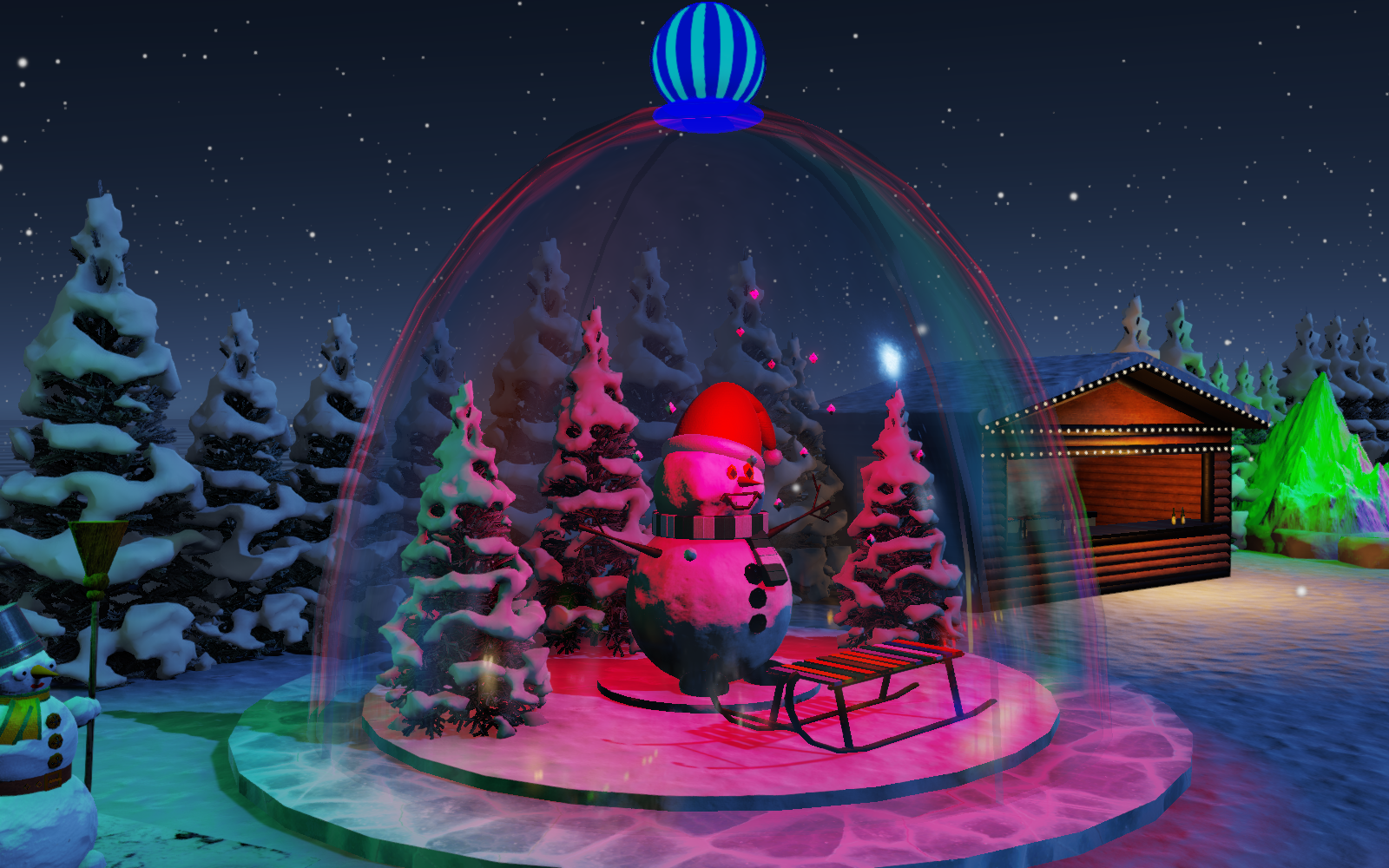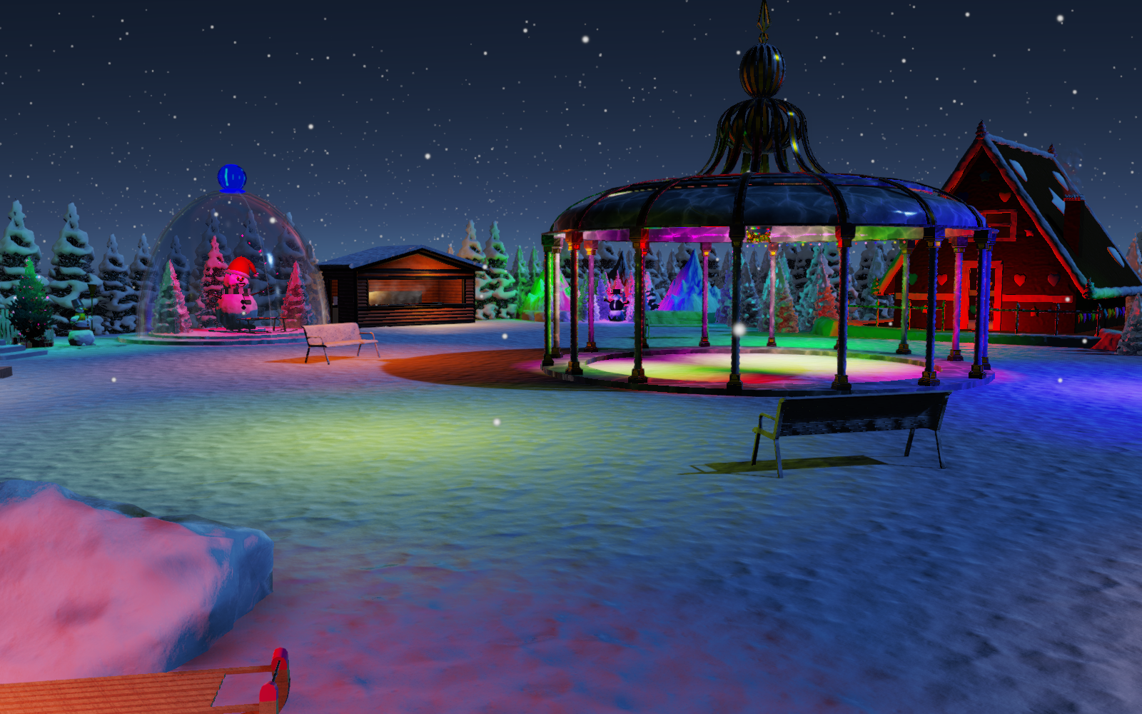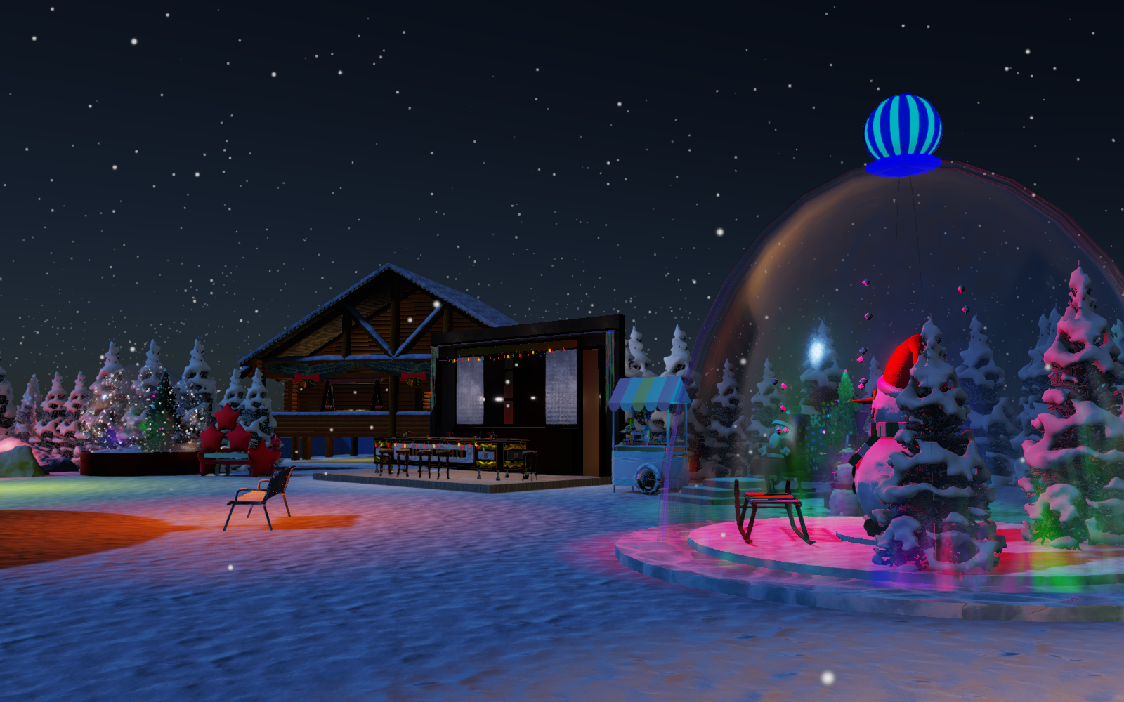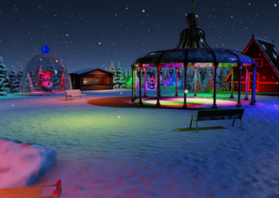 Verschneiter Weihnachtsplatz unter klarem Sternenhimmel: in der Mitte ein beleuchteter Pavillon als Tanz- und Treffpunkt, rundherum Schnee, Bänke und bunte Lichtreflexe auf dem Boden. Daneben eine riesige Schneekugel mit Schneemann und Tannen, ein gemütliches Holzhaus mit warmem Fensterlicht und kleine Markt-/Bar-Häuschen für Winterdrinks und süße Pausen.